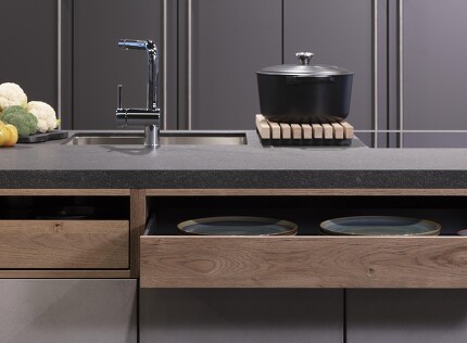 Vielleicht ist es Ihnen schon in der ein oder anderen Einrichtungszeitschrift oder in einer Küchenausstellung aufgefallen: In Designküchen wird häufig darauf verzichtet, die Arbeitsplatte über die Küchenunterschränke überstehen zu lassen, besonders häufig dann, wenn extradünne Arbeitsplatten verwendet wurden. Das sieht zugegeben um einiges schicker aus, birgt aber natürlich den Nachteil, dass wenn Flüssigkeiten beim Hantieren heruntertropfen, sie auch an den Schranktüren landen werden. Steht die Arbeitsplatte wenige Zentimeter über, geschieht dies nicht so schnell, und es lassen sich auch Krümel und Schnippelreste um einiges leichter in den unterhalb der Kante gehaltenen Mülleimer wischen.