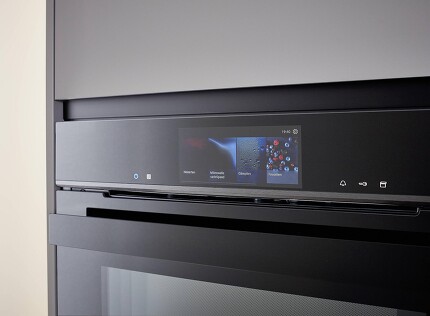 Die ausbalancierte Aufteilung um eine Mittelachse schafft eine formschöne Einheit, deren Symmetrie noch dadurch betont wird, dass die Küchengriffe an der Hochschrankzeile auf ihrer linken Hälfte jeweils rechts an den Schranktüren und vice versa rechts angebracht sind.