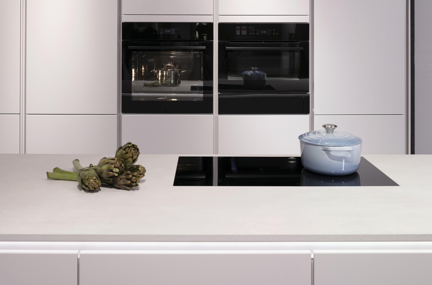 Der Trend zum Schwarz hält an und sorgt dafür, dass auch die Gerätehersteller möglichst viel schwarz gestalten, das früher noch silbern hervorblitzte: Ehemalige Edelstahlelemente werden entweder durch schwarze ersetzt oder weggelassen und kommen mit griffloser Gestaltung aus, bei der sich Gerätetüren durch Antippen oder auf Zuruf öffnen. Letzteres hilft, Fingerabdrücke zu vermeiden, denn gerade wenn die Ausführung in Schwarzglas erfolgt, werden sie störend sichtbar.