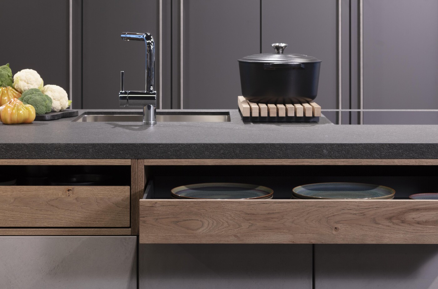 Schubkästen, die nach vorne zu einem Drittel oder Viertel offen sind – man sieht sie jetzt immer häufiger in neuen Küchen. Je nach Küchenhersteller werden sie als Auszugsregal oder Englischer Zug bezeichnet. Ihre Bauform ist typisch für Ladenmöbel, auch für alte Schreibtische, Rolladen- oder Wäscheschränke.