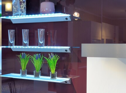 Auch mit weniger als zehn Quadratmetern kann eine Küche mit viel Stauraum ausgestattet sein und trotzdem weiträumig wirken. Hochglanzfronten sorgen z.B. mit ihrem Spiegeleffekt für optische Raumvergrößerung. Die Küchenunterschrank-Beleuchtung unterstützt diesen Effekt mit ihrer Reflexion im Küchenschrank über Eck. Der Arbeitsbereich erfährt durch das blendfreie indirekte Licht noch eine extra Ausdehnung. Die Rückwandverkleidung ist in diesem Beispiel aus leicht abwaschbarem glänzend-bedrucktem Melamin: eine geschlossene Fläche, die kleinen Küchen insgesamt gut tut.